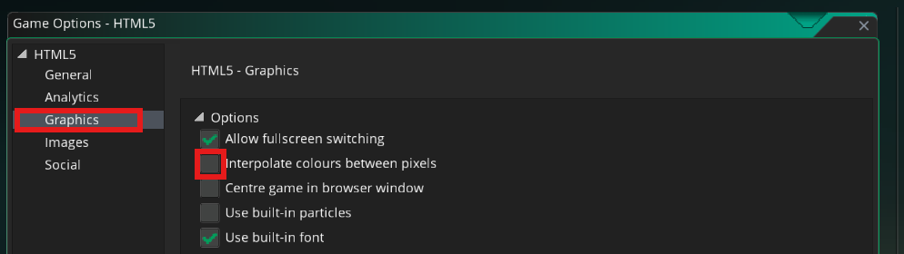then, go to Graphics and uncheck Interpolate colors between pixels.